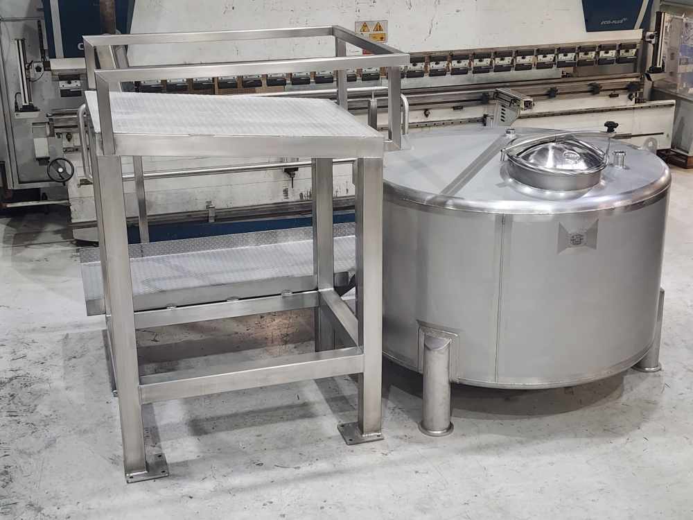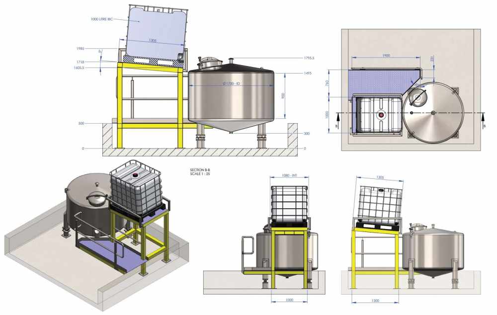 Just finished a neat 2000 litre buffer tank mounted on load cells to store liquid that arrives on site in IBCs. Included is a stainless operator platform and IBC support frame set on an angle to fully drain the IBC. Whole setup to be installed in a bounded area.