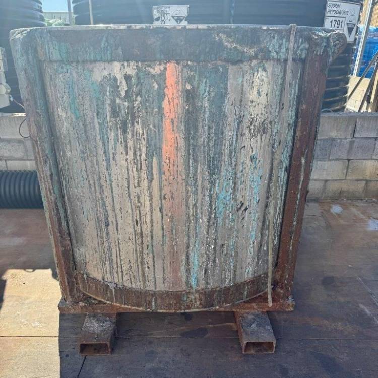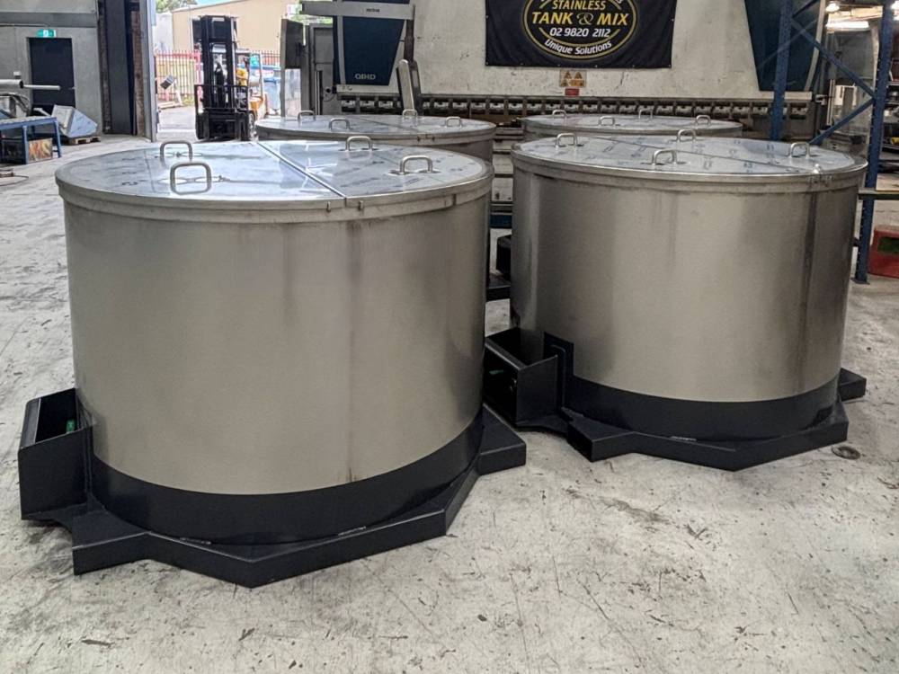 Stainless Tank and Mix custom fabricated four 2000 litre chemical mix tanks that can be forklifted. The overall height required a critical fit under the existing mixer. As can be seen in the photo of the existing tank, it had experienced a hard life.