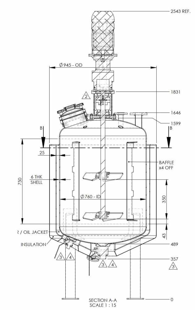 1 of 3 jacketed reactors. This vessel is a 300 litre vacuum vessel with operating pressure of full vacuum, a hot oil jacket pressure of 300kPa at 100˚C.