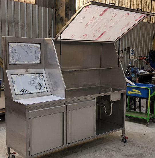 This laboratory bench includes 2 off lexan faced PC monitor locations, 2 off full stainless steel soft close draws, 2 off doors with integral folded handles, fully welded sink with stainless steel waste pipe, behind a framed lexan hood with gas struts.