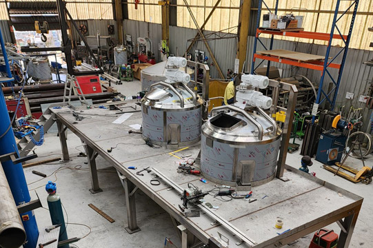 2 off jacketed contra-mix tanks fabricated from SAF2205 – a duplex stainless steel for a corrosive environment and fitted to a full stainless steel platform